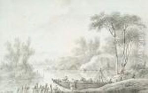 River Landscape With Three Figures Loading A Boat Tied Up At The River Bank