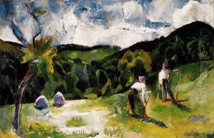 Vilmos Aba-Novák’s Felsobányai Táj (On The Field) captures the raw, vibrant essence of rural Hungary through expressive brushwork and bold contrasts. Painted in the early 20th century, this work exemplifies Aba-Novák’s mastery of post-Impressionist and Expressionist influences, merging dynamic composition with emotional depth. Rolling fields under vast skies dominate the scene, rendered in earthy hues punctuated by vivid greens and blues, evoking both serenity and the untamed vitality of nature. As a central figure in Hungarian modernism, Aba-Novák’s contributions were pivotal in bridging European avant-garde movements with national traditions. This piece reflects his ability to transform everyday rural life into a powerful visual narrative, securing his legacy in Central European art history. Felsobányai Táj remains celebrated for its evocative energy and technical brilliance, offering viewers a visceral connection to the Hungarian landscape.