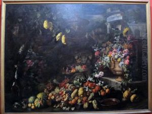 Still Life With Grapes, Melon, And Pomegranates On A Stone Ledge