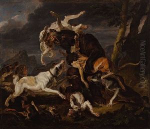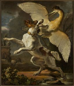 A Swan Being Chased From Her Nest By Three Hounds, In An Evening Landscape