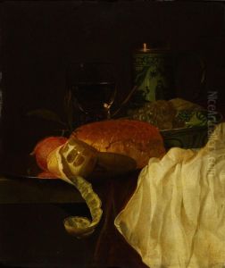 A Still Life With A Roemer, A Peeled Lemon, Bread, Roses On Apewter Plate, An Orange And Cherries, All On A Draped Table