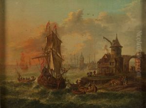 Estuary Scene With Dutch Shipping In The Foreground, A Town Beyond