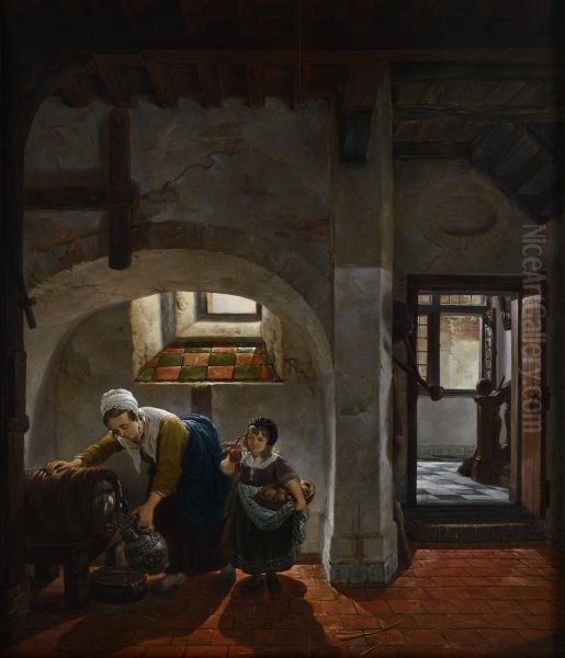 Voorraadkelder met een vrouw die een stenen kruik vult en een kind