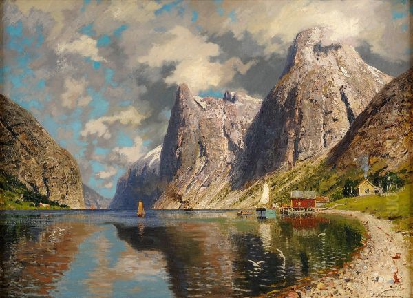 Adelsteen Normann's Summer in Fjord (c. 1890s) captures the pristine beauty of Norway's western fjords with luminous tranquility. Bathed in soft golden light, the painting depicts serene waters mirroring steep cliffs, where scattered cottages nestle amidst lush greenery—a testament to Normann's mastery of Romantic realism. As a leading figure of the Düsseldorf School, his works bridged 19th-century European landscape traditions with emerging plein-air techniques. This particular piece exemplifies his signature blend of precise topography and atmospheric drama, elevating Norway's natural grandeur to poetic heights. Historically, Normann played a pivotal role in popularizing fjordscapes internationally, influencing later Nordic artists like Hans Gude. The painting's harmonious balance between realism and idealism solidifies its status as a jewel of Northern European landscape art.