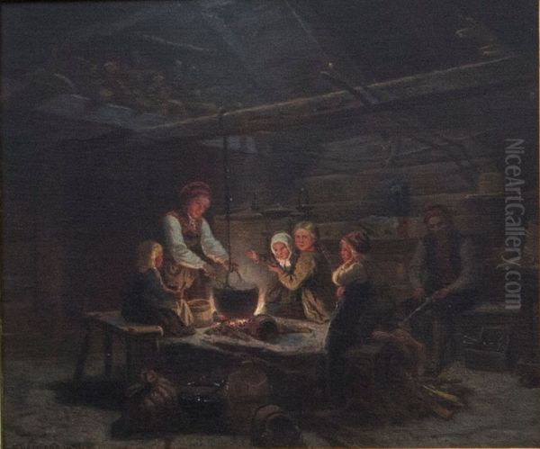 Adolph Tidemand's En seterhytte (A Mountain Dairy) is a quintessential example of 19th-century Norwegian Romantic nationalism, capturing the serene yet rugged beauty of rural life. The painting depicts a traditional seterhytte, or summer pasture dwelling, nestled in a lush mountainous landscape, with figures in folk costumes tending to their daily tasks. Tidemand's meticulous attention to detail—from the weathered wooden structure to the soft play of light filtering through the trees—creates an idyllic, almost nostalgic atmosphere. As a leading figure in the Norwegian folk revival movement, Tidemand celebrated rural traditions during a time of growing national identity. This work, with its harmonious blend of realism and romantic idealism, remains a touchstone in Scandinavian art history, reflecting both the cultural heritage and the timeless allure of nature.