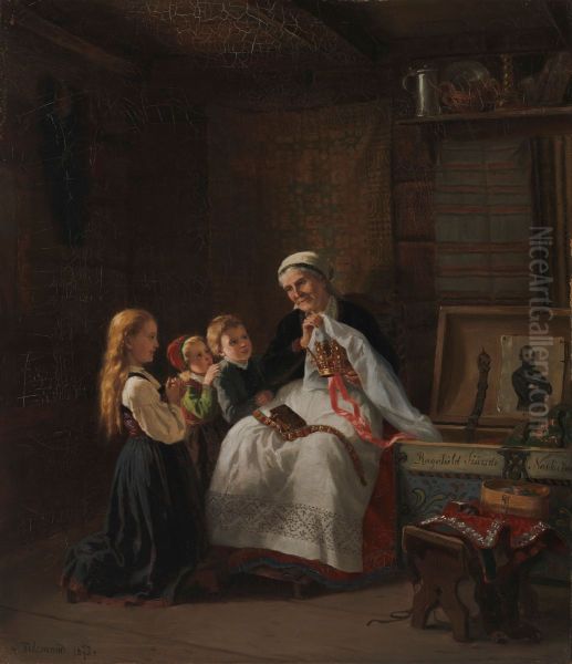 Adolph Tidemand’s Grandmother’s Bridal Crown (1848) is a poignant tribute to Norwegian folk traditions and national romanticism. The painting depicts an elderly woman tenderly holding her granddaughter’s bridal crown, a symbol of heritage and continuity. The warm, subdued tones and meticulous details—like the intricate metalwork of the crown and the grandmother’s traditional bunad—evoke nostalgia and quiet pride. Tidemand, a key figure in Norway’s 19th-century art revival, masterfully blends realism with sentimental storytelling, elevating everyday Norwegian life into national iconography. This work exemplifies the nasjonalromantikk movement, which sought to preserve local customs amid modernization. Its cultural significance and emotional depth make it a cornerstone of Nordic art history, often studied for its fusion of ethnography and fine art.