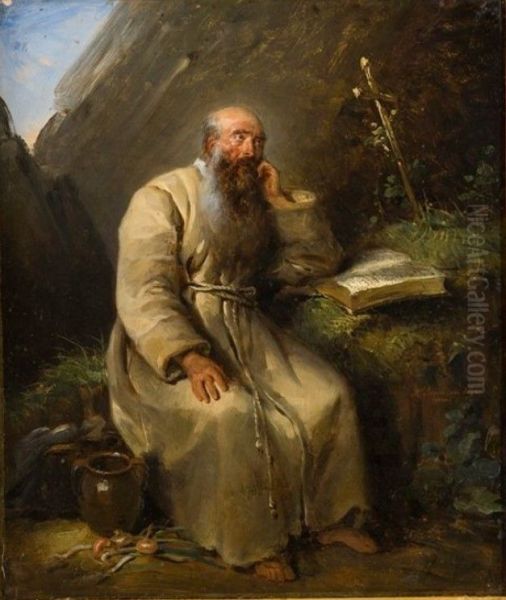 For interior decor, L'Ermite du Mont Denise would harmonize beautifully in a study, library, or office, where its meditative aura fosters focus. A medium to large-scale reproduction (around 24x36 inches) would anchor a wall without overwhelming the space. Pair it with rustic wooden frames or minimalist gilded accents to enhance its timeless appeal. The painting’s earthy greens and soft browns complement neutral tones—think linen upholstery or warm gray walls—while its tranquil mood suits spaces designed for reflection. For a cohesive look, incorporate natural textures like stoneware, leather, or woven textiles. Positioning it near a reading nook or above a console table with antique books amplifies its narrative charm, creating an evocative focal point. In a modern setting, contrast its classical style with sleek furniture to strike a balance between heritage and contemporary elegance.