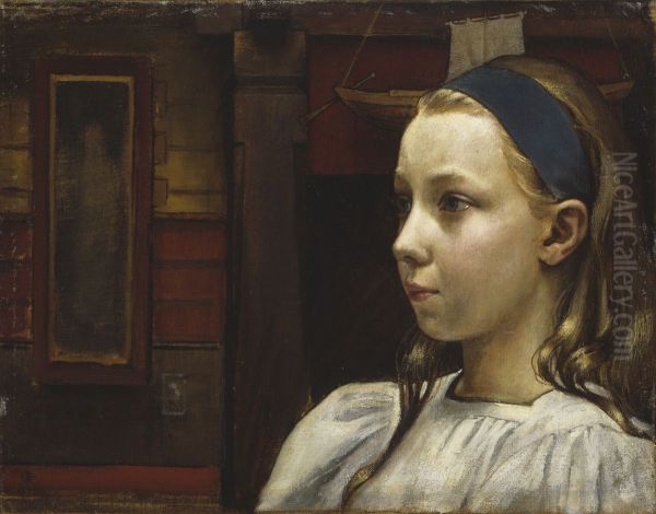 The painting Tyton paa, Pikku Anna ("Girl Braiding Her Hair, Little Anna") by Finnish artist Akseli Valdemar Gallen-Kallela is a captivating example of late 19th-century Nordic Romanticism infused with emerging Symbolist elements. Depicting a young girl engrossed in braiding her hair, the work exudes an intimate, almost meditative atmosphere through its soft brushwork and warm, earthy tones. Created during Gallen-Kallela's transitional period (1887–1890), it showcases his shift from naturalistic academic painting toward the stylized forms that would later define his Kalevala-inspired masterpieces. The composition's quiet domesticity belies its artistic significance – this was among the first Finnish artworks to elevate everyday folk life into high art, anticipating the national romantic movement. Rendered with remarkable tactile sensitivity in the girl's flowing hair and traditional linen shirt, the painting stands as a bridge between European realism and Finland's distinctive artistic identity.