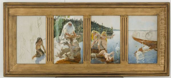 "Akseli Gallen-Kallela's Väinämöinen Spelar (1896) immerses viewers in Finland's mythological essence through its mesmerizing depiction of the wise old sage Väinämöinen playing his magical kantele. The painting radiates an otherworldly glow, with shimmering blue waters reflecting celestial light as white swans glide gracefully – symbolic creatures drawn from the Kalevala epic. Executed during Finland's nationalist awakening, Gallen-Kallela pioneered the "Kalevala Style," blending Art Nouveau's sinuous lines with Symbolist mysticism and meticulous realism in natural elements. This masterwork became iconic in establishing Finnish cultural identity through art, with its harmonious fusion of myth, nature, and musicality representing the golden era of Nordic Romanticism. The painting's spiritual quality and technical brilliance cement its status as Finland's most reproduced artwork, embodying the soul of Finnish artistic heritage.