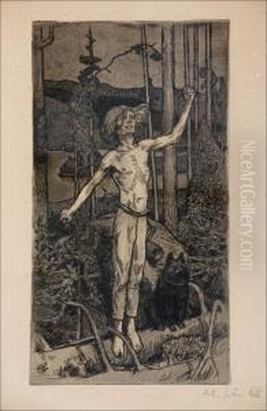 Akseli Valdemar Gallen-Kallela’s Kullervo's Curse (1899) is a hauntingly powerful depiction of tragedy from the Finnish epic Kalevala, capturing Kullervo’s moment of despair as he realizes he has unknowingly seduced his own sister. The composition is dominated by dark, brooding tones—charcoal grays and deep blues—that amplify the emotional weight of the scene. Gallen-Kallela’s use of vigorous brushstrokes and symbolic storytelling aligns with the National Romantic style, merging Finnish folklore with European Symbolist influences. This work holds immense significance in Nordic art history, as it reflects Finland’s cultural awakening during the late 19th century, blending national identity with universal themes of fate and remorse. The painting’s intensity makes it a seminal piece in Gallen-Kallela’s oeuvre, bridging myth and modern artistic expression.