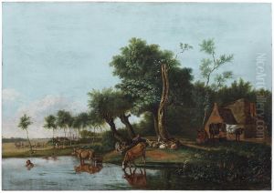 Herdsmen With Cattle In A Summer Landscape