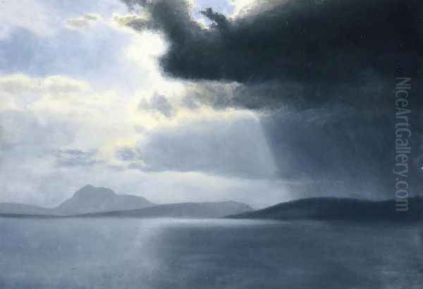 Albert Bierstadt's Approaching Thunderstorm On The Hudson River (1859) captures nature’s dramatic grandeur with striking realism. The painting depicts the Hudson River Valley under brooding storm clouds, where shafts of sunlight pierce through the turbulent sky, illuminating the landscape below. Bierstadt, a leading figure of the Hudson River School, masterfully blends sublime Romanticism with meticulous detail—his luminous effects and dynamic contrasts heighten the scene’s emotional intensity. The work exemplifies 19th-century American landscape painting, reflecting both awe for wild nature and national optimism during westward expansion. Today, it stands as a quintessential example of Luminism, celebrated for its atmospheric depth and symbolic interplay of transience and permanence.