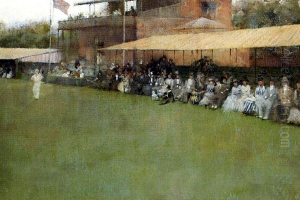 Albert Chevallier Tayler’s Eton vs Harrow at Lords (1905) captures the timeless spirit and refined spectacle of English cricket traditions. This vibrant oil painting depicts the annual match between Eton and Harrow at Lord’s Cricket Ground, bathed in golden sunlight that highlights the crisp whites of the players’ uniforms and the animated spectators in the stands. Tayler, a noted British impressionist, blends loose brushwork with meticulous detail—particularly in the figures—to convey dynamic motion and aristocratic elegance, emblematic of late Edwardian leisure culture. Beyond its sporting subject, the work celebrates social ritual and national identity, securing its status as both a sporting icon and historical document in British art. Its significance lies in Tayler’s ability to elevate genre painting into a narrative of collective memory, bridging realism and impressionism.