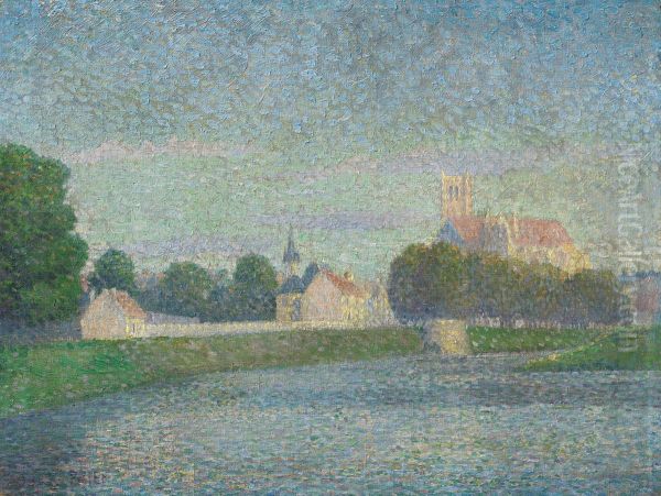 Albert Dubois-Pillet’s Morgen auf der Marne in Meaux (Morning on the Marne at Meaux) is a radiant example of Pointillist landscape painting, capturing the tranquil beauty of dawn along the Marne River. The scene shimmers with meticulously placed dots of color, blending harmoniously to evoke the soft glow of morning light on water and foliage. Dubois-Pillet, a Neo-Impressionist and military officer, was deeply influenced by Seurat’s scientific approach to color theory, yet his work retains a poetic sensitivity unique to his style. Painted in the late 19th century, this piece reflects the avant-garde spirit of the era, bridging Impressionism’s spontaneity with Pointillism’s structured technique. Though lesser-known than contemporaries like Signac, Dubois-Pillet’s innovative use of light and color secured his place as a significant figure in Post-Impressionist art history. The painting’s serene yet vibrant energy makes it a compelling study of nature’s quiet moments.