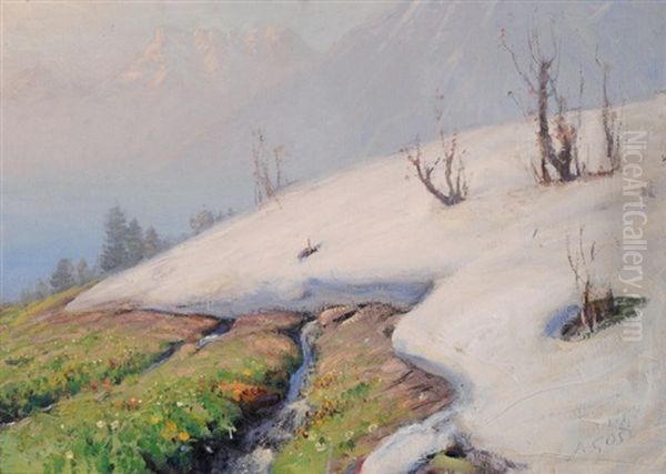 Albert H. Gos’ Hiver Et Printemps (Winter and Spring) is a captivating landscape painting that elegantly captures the transition between seasons, blending the stark serenity of winter with the budding vitality of spring. Executed in a refined Impressionist style, Gos’ brushwork delicately balances realism and atmospheric impression, creating a dreamlike quality where muted snow-laden scenes gradually give way to warmer, verdant touches. The painting reflects Gos’ Swiss heritage and his mastery of natural light, often compared to the tonal harmonies of Corot or the poetic realism of the Barbizon School. Though lesser-known than his contemporaries, Gos’ works occupy an important niche in late 19th-century European landscape painting, embodying a bridge between traditional realism and early modernist experimentation with mood and ephemeral beauty.