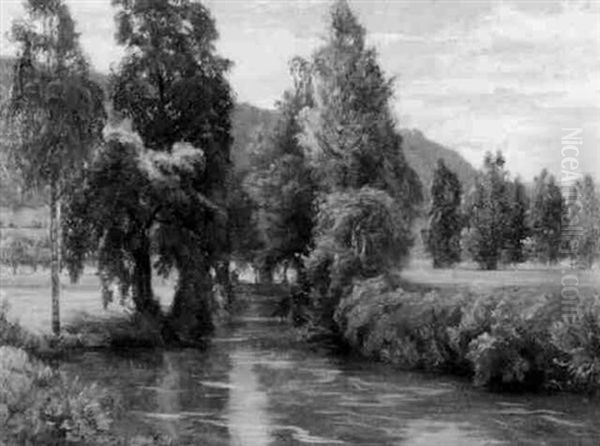 Albert Lang’s Morgen am Fluss (Morning by the River) is a serene yet evocative landscape painting that captures the quiet beauty of dawn along a riverbank. Rendered in a delicate yet expressive style, Lang’s work blends elements of Impressionism and Realism, with soft brushstrokes conveying the shimmering light on water and the hazy transition from night to day. Created in the late 19th or early 20th century, the painting reflects the Romantic tradition’s reverence for nature while showcasing Lang’s distinctive ability to infuse tranquil scenes with emotional depth. Though not as widely known as some of his contemporaries, Lang’s works occupy a notable place in German landscape painting, admired for their atmospheric quality and lyrical composition. Morgen am Fluss embodies a moment of stillness, inviting viewers to pause and contemplate the quiet majesty of the natural world.