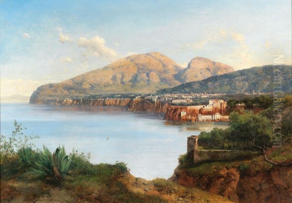 Albert Zimmermann’s A View of Sorrento captures the radiant charm of Italy’s coastal landscape with breathtaking luminosity. Painted in the mid-19th century, Zimmermann—a German Romantic artist—skillfully blends meticulous detail with emotive atmospheric effects, portraying Sorrento’s cliffs bathed in golden light and the tranquil Tyrrhenian Sea stretching beyond. His work reflects the Romantic era’s fascination with nature’s sublime beauty, while also showcasing influences from the Nazarene movement’s precision and Italian veduta traditions. Though less renowned than his contemporaries like Turner or Friedrich, Zimmermann’s landscapes hold a distinct place in European Romanticism for their lyrical balance of realism and idealism. The painting’s serene yet dramatic composition invites viewers to linger, offering both geographical specificity and timeless escapism.