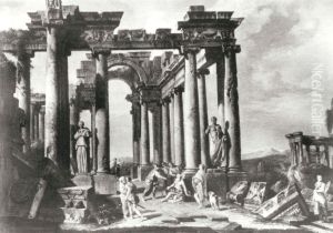 The luminous painting Elegant Figures Amongst Classical Ruins by Italian artist Alberto Carlieri (1672–after 1720) transports viewers to an idealized vision of antiquity, where graceful figures clad in rich drapery converse and wander amidst towering Corinthian columns and weathered stone fragments. Bathed in warm Mediterranean light, the scene balances grandeur with intimacy, evoking nostalgia for classical civilization while showcasing Carlieri’s mastery of the capriccio tradition—fantastical architectural compositions popular among 18th-century artists like Panini and Piranesi. Though less renowned than his contemporaries, Carlieri’s work exemplifies the Baroque era’s theatricality and fascination with archaeology, bridging the gap between rigorous perspective studies and romanticized history painting. The intricate detailing of fractured friezes and billowing fabrics reveals his academic training in Rome, while the subdued yet harmonious palette nods to Venetian colorism.