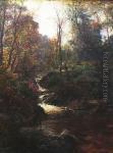 In Alexander Brownlie Docharty’s A River Landscape, the viewer is drawn into a serene yet evocative portrayal of nature’s tranquility. The painting captures a softly flowing river, framed by lush foliage and bathed in a gentle, diffused light that suggests either dawn or dusk. Docharty, a Scottish painter active in the late 19th and early 20th centuries, was known for his Romantic-Realist approach, blending meticulous detail with an emotive atmosphere. His works often reflect the influence of the Barbizon School, emphasizing naturalism and tonal harmony. A River Landscape exemplifies this style, offering a poetic meditation on the Scottish countryside. While not as widely recognized as his contemporaries like the Glasgow Boys, Docharty’s contributions to British landscape painting remain significant, particularly for their quiet lyricism and technical finesse, making this piece a subtle gem in the canon of late Victorian art.
