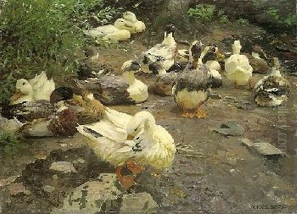 Alexander Max Koester’s Enten am Lagerplatz (Ducks at the Storage Yard) is a captivating late 19th-century masterpiece that exudes warmth and tranquility through its soft, impressionistic brushwork. The painting depicts a serene scene of white ducks gathered in a rustic storage area, bathed in dappled sunlight that highlights their delicate plumage and the textured surroundings. Koester, often called the "duck painter," specialized in avian subjects, blending realism with the loose, light-infused techniques of Impressionism. This work exemplifies his ability to capture both the natural grace of animals and the poetic interplay of light and shadow. Though less renowned than his French Impressionist contemporaries, Koester’s paintings are celebrated for their meticulous detail and atmospheric depth, occupying a unique niche in Germanic art of the period. Enten am Lagerplatz reflects a harmonious balance between genre painting and plein air spontaneity, making it a subtle yet significant piece in the transition from academic tradition to modern sensibility.