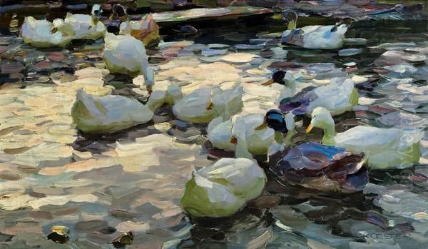 Alexander Max Koester’s Zwolf Enten (Twelve Ducks) captivates viewers with its serene yet lively depiction of ducks gliding on a reflective water surface. Painted in the late 19th or early 20th century, Koester, a German Impressionist, masterfully blends realism with loose, expressive brushstrokes, infusing vitality into the scene. Known as the "duck painter," his works often highlight the interplay of light and water—seen here in the shimmering ripples and subtle tonal shifts. This piece exemplifies Koester’s signature focus on avian subjects and natural harmony, placing him among the notable European animaliers of his time. Though not as widely recognized as Monet or Manet, his contributions to Impressionist animal painting remain significant, offering a bridge between academic precision and modern spontaneity.