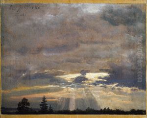 Alexandre Calame's Soleil Couchant Derrière Une Forêt (Sunset Behind a Forest) immerses viewers in a sublime Romantic landscape where nature’s grandeur takes center stage. Painted in the mid-19th century, this work exemplifies Calame’s mastery in capturing the dramatic interplay of light and shadow, with the setting sun casting a golden glow through dense foliage while towering trees frame the scene in near-silhouette. A Swiss artist renowned for his Alpine vistas, Calame belonged to the Düsseldorf School, which emphasized realism infused with emotional depth—qualities that made his works highly sought after by European collectors. The painting reflects the era’s fascination with the sublime, where nature’s untamed beauty evokes awe and contemplation. Historically, Calame’s works bridged Romanticism’s idealism and the precision of later plein-air painting, influencing landscape traditions across Europe.