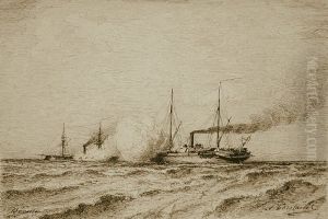 Alexey Bogolyubov’s A Sea Battle is a dramatic and atmospheric masterpiece, capturing the raw power and chaos of naval warfare with breathtaking realism. Painted in the 19th century during the height of maritime conflicts, Bogolyubov—a Russian artist celebrated for his marine paintings—imbues the scene with turbulent waves, billowing smoke, and meticulously detailed warships locked in combat. The work exemplifies Romanticism’s fascination with nature’s sublime force and human heroism, while retaining precise technical accuracy reflective of Bogolyubov’s training as a naval officer. His deep understanding of seafaring lends authenticity to the composition, making it a significant contribution to maritime art history. As a student of Ivan Aivazovsky and an academician himself, Bogolyubov bridges Romantic emotiveness with the disciplined realism favored by imperial patrons, securing his position among Russia’s foremost marine painters.