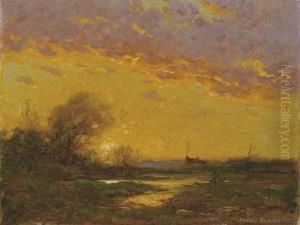 "Sunset" by Alexis Fournier (1865–1948) captures the serene yet evocative beauty of twilight with masterful brushwork. Painted in the late 19th or early 20th century, this oil landscape embodies the tonalist aesthetic—a movement characterized by muted palettes, soft focus, and an emphasis on mood over detail. Fournier, a lesser-known but skilled American artist, worked during a period when American Impressionism and Tonalism were redefining landscape painting. The artwork likely depicts the rural American Midwest, where Fournier often found inspiration. Its hazy golden horizon and silhouetted trees evoke quiet contemplation, bridging the gap between realism and poetic abstraction. While not as famous as works by Whistler or Inness, "Sunset" represents Tonalism’s subtle influence on modern atmospheric painting, offering a timeless meditation on nature’s quiet moments.