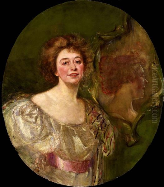 Alice Pike Barney’s Self-Portrait Reflected in Mirror captures an arresting duality of introspection and artistry. Painted circa 1890s, the work exudes the Aesthetic Movement’s penchant for elegance and symbolism, blending soft brushwork with a contemplative mood. The artist—mother of famed playwright Natalie Clifford Barney—depicts herself twice: once directly and again reflected in a mirror, suggesting layered identities. The muted palette and delicate rendering reflect her Parisian training under painters like Whistler and Carolus-Duran. Though lesser-known than her male contemporaries, Barney’s intimate self-portraiture offers a nuanced glimpse into female artists' self-representation during the Gilded Age, bridging realism and emerging modernity.