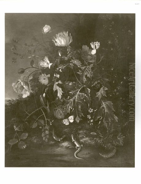 Alida Withoos' "Flower Still Life with Kingfisher and Lizard in a Landscape" (c. 1690) is a spellbinding testament to Dutch Golden Age botanical artistry, where scientific precision dances with symbolic poetry. The canvas thrums with life – velvety petals tremble beside a jewel-toned kingfisher mid-alight, while a sinuous lizard anchors the tableau to weathered stone textures. Withoos, among the rare documented female still-life painters of her era, mastered the pronkstilleven (sumptuous still life) tradition while infusing it with uncanny wildlife vitality. Her work bridges 17th-century interest in exotic specimens (reflecting Dutch colonial trade networks) with emerging Rococo sensibilities – note how the composition balances meticulous botanic accuracy (likely honed at the Amsterdam Hortus Botanicus) with playful asymmetry. This piece occupies a fascinating niche in art history, foreshadowing Maria Sibylla Merian’s ecological studies while rivaling male contemporaries like Jan van Huysum in technical brilliance. The kingfisher – considered a solar symbol in Chinese lore and Christian iconography alike – perched beside ephemeral blooms creates poignant vanitas undertones, whispering of life’s fleeting beauty.