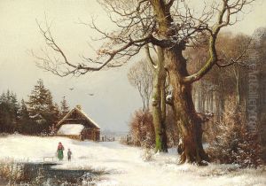 Vinterlandskab med kone pa en landevej ud for et hus.