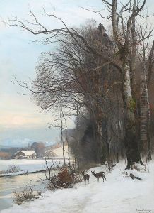 Winter landscape from South Germany with deer, woodlands and a stream.
