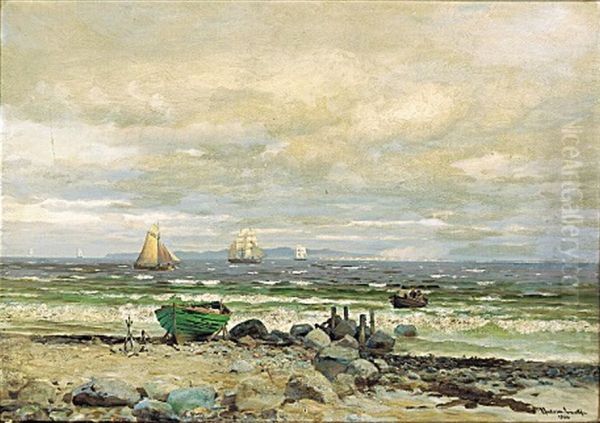 Anders Andersen-Lundby's painting At the Beach North of Kronborg, Denmark captures the serene yet dramatic beauty of Denmark’s coastline. The artwork, rooted in the late 19th-century Danish realist tradition, portrays a windswept shore near the historic Kronborg Castle—a setting imbued with literary significance as the backdrop for Shakespeare’s Hamlet. Lundby’s brushwork masterfully balances meticulous detail with atmospheric depth, rendering the overcast sky and choppy waves with a restrained, almost melancholic palette of grays, blues, and muted earth tones. This piece exemplifies the era’s fascination with national landscapes and maritime themes, positioning Lundby as a lesser-known but skilled practitioner of Northern European realism. While not as celebrated as his contemporary Peder Severin Krøyer, Lundby’s works offer a quieter, introspective take on Denmark’s natural heritage, making this painting a subtle gem in Scandinavian art history.