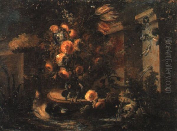 Flores Y Ave En Un Paisaje Con Fuente