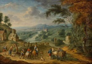 An Extensive Wooded Landscape With Travellers In The Foreground, A Castle On A Hill Beyond