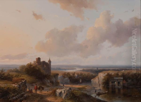 Andreas Schelfhout's Summer Panorama (1846) epitomizes the Romantic allure of Dutch landscape painting, capturing an idyllic countryside bathed in golden sunlight. The composition unfolds like a pastoral symphony: verdant meadows stretch toward a softly lit horizon, dotted with grazing cattle and leisurely figures—a tranquil homage to 17th-century Dutch masters like Jacob van Ruisdael. Schelfhout's meticulous attention to atmospheric effects, from the wispy clouds to the reflective water channels, embodies the plein-air sensitivity that bridged Romanticism and the Hague School. Celebrated as a key influencer of later luminaries like Johan Jongkind, this work exemplifies Schelfhout’s mastery in balancing topographical precision with poetic idealism, securing his legacy as a pillar of 19th-century European landscape art.