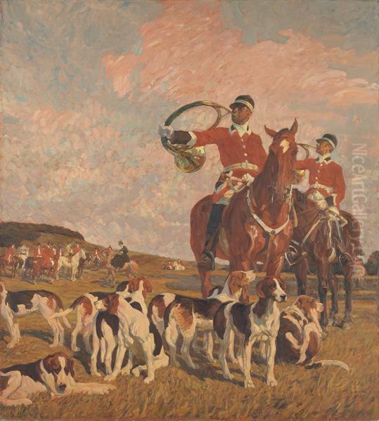 Hallali by Angelo Jank immerses the viewer in the exhilarating drama of a traditional hunt, capturing the climax as horses and hounds surge forward in a dynamic, almost chaotic motion. Painted in the early 20th century, this masterpiece exemplifies Jank's expertise in animal and equestrian scenes, showcasing his realistic yet expressive brushwork influenced by late 19th-century German Romanticism and Impressionism. The composition thrums with energy—gusts of wind tousle the riders’ coats, hooves kick up earth, and the hunting dogs snap at the air, creating a vivid sense of immediacy. Jank, then-president of the Munich Artists' Association, bridged academic precision with a modern vitality, making Hallali a significant work in the transition from traditional hunting scenes to more dynamic, emotionally charged depictions. Its historical value lies in preserving aristocratic European hunting culture while embracing artistic innovation.
