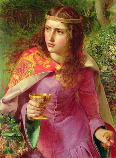 In Queen Eleanor, 1858, Anthony Frederick Sandys crafts a mesmerizing portrait steeped in medieval romance and Pre-Raphaelite allure. The painting depicts Eleanor of Aquitaine—a powerful 12th-century queen—with striking realism and intricate detailing, her piercing gaze and flowing garments embodying both regality and melancholy. Sandys, a key figure in the Pre-Raphaelite movement, employed vibrant colors, meticulous textures, and symbolic elements (like the trailing ivy, representing fidelity) to blur history and myth. The work exemplifies the Brotherhood’s rejection of industrial-era aesthetics, instead reviving Gothic elegance and emotional depth. Though less famed than Rossetti or Millais, Sandys’ Queen Eleanor remains a cornerstone of Victorian art, celebrated for its fusion of historical narrative and poetic intensity.