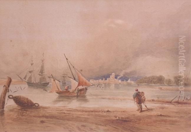 Anthony Vandyke Copley Fielding’s Estuary Scene With Figures is a captivating example of British Romantic landscape painting, embodying the serene yet evocative qualities of early 19th-century art. The painting depicts a tranquil estuary, likely inspired by the picturesque coastlines of England, where soft, diffused light bathes the scene in a dreamlike haze. Fielding, a leading figure of the English watercolor movement, masterfully balances natural detail with atmospheric effects—murmuring water, distant sailboats, and small figures add life without disrupting the harmony. His delicate brushwork and muted yet luminous palette reflect influences from J.M.W. Turner, under whom he studied. Though less celebrated today, Fielding was highly regarded in his time, particularly for his ability to blend topographical precision with poetic mood, making this work a subtle bridge between Romanticism and Victorian realism.