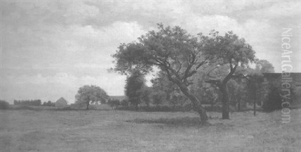 Sommerliche Landschaft Mit Obstbaumen Und Ein Gehoft Im Hintergrund