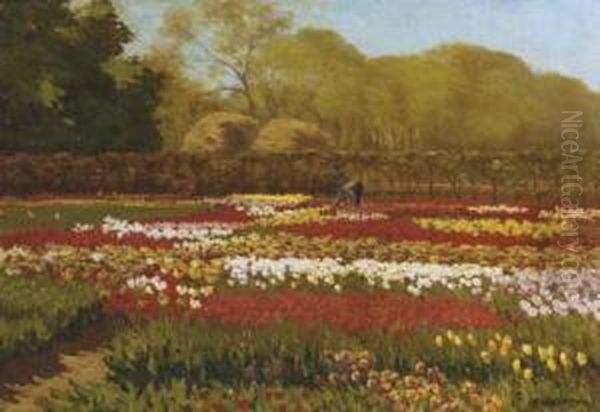 Anton Lodewijk Koster's A Beautiful Day In A Tulipfield captures the quintessential charm of Dutch floral landscapes, radiating vitality through its vibrant hues and meticulous detail. Painted during the late 19th to early 20th century, this work exemplifies Koster’s specialization in tulip fields, a subject that celebrates Holland’s horticultural heritage. The composition brims with swaying rows of tulips in saturated reds, yellows, and pinks, contrasted against a soft sky, evoking a sense of serene abundance and seasonal renewal. Koster’s post-impressionist style blends realism with expressive brushwork, situating him among notable European floral painters like Claude Monet, though his focus on tulips remains distinctive. While not as widely recognized as Van Gogh’s florals, Koster’s works are prized for their documentary and aesthetic value, offering a romanticized yet authentic glimpse into the Netherlands' iconic landscapes.