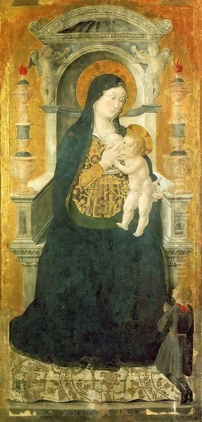 The Madonna del Latte by Antoniazzo Romano is a tender and intimate depiction of the Virgin Mary nursing the Christ Child, radiating warmth and maternal devotion. Painted in the late 15th century during the Italian Renaissance, it reflects the artist’s signature style—combining Byzantine iconography’s solemnity with the emerging naturalism of the Renaissance. The figures are enveloped in soft, luminous hues, with Mary’s gentle gaze and the Child’s serene expression evoking a profound spiritual connection. Antoniazzo Romano, a leading figure in Rome’s artistic scene, bridged medieval traditions and Renaissance innovations, making this work a significant example of transitional religious art. Today, it is admired not only for its delicate craftsmanship but also as a window into the era’s evolving devotional aesthetics.