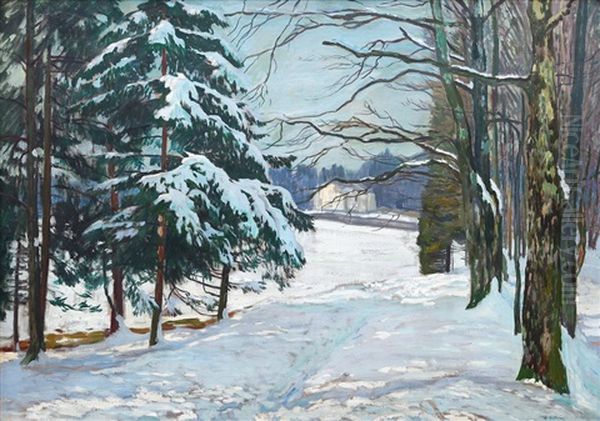 Antonín Hudeček’s Zasněžený Park (Snowy Park) transports viewers into a serene winter dreamscape, where delicate brushstrokes evoke the quiet poetry of snow-laden trees and soft, diffused light. Painted in the early 20th century, this Czech Impressionist masterpiece reflects Hudeček’s mastery of mood and atmosphere, blending the tonal sensitivity of Symbolism with the loose, luminous touch of Impressionism. The subdued palette of blues, grays, and ochres creates a meditative harmony, capturing the hushed stillness of a snowbound park. As a leading figure in Czech landscape painting, Hudeček’s work bridges late-19th-century romanticism and modern sensibility, earning him acclaim for his ability to infuse nature with emotional depth. Zasněžený Park exemplifies his signature style, where meticulous observation meets lyrical abstraction, securing its place as a gem of Central European Impressionism.