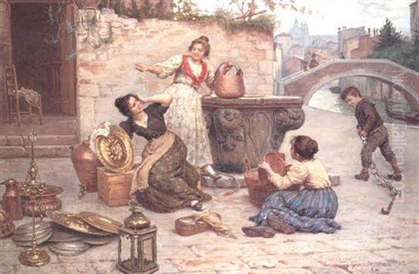 Antonio Paoletti’s Cleaning The Brass is a captivating genre painting that whisks viewers into a quiet, intimate moment of domestic life in 19th-century Venice. The warm, golden glow of polished brass reflects softly across the scene, highlighting the meticulous brushwork and delicate interplay of light and shadow—hallmarks of Paoletti’s academic realism. The painting exudes a sense of timeless serenity, as its subject, often interpreted as a maid or housewife, engages in her task with quiet diligence. Paoletti was celebrated for his ability to elevate everyday vignettes into poetic narratives, blending Venetian tradition with subtle Romantic undertones. Though less widely known today than his contemporaries like Favretto or Giacomo Favretto, Paoletti’s work remains significant for its ethnographic charm and technical precision, offering a window into the textures of 19th-century Italian domesticity.