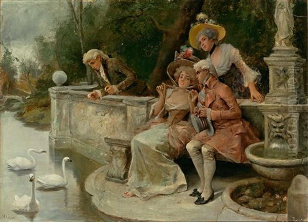 Parkszene Mit Zwei Eleganten Paaren In Kostumen Des 18. Jh.