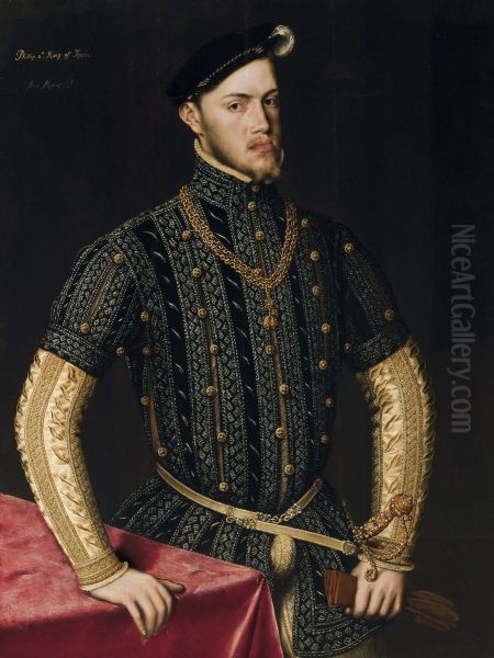 The Portrait of Felipe II by Antonis Mor is a striking embodiment of 16th-century courtly grandeur and psychological depth. Painted around 1557, this masterwork captures the young Spanish king in luxurious black attire, his austere expression contrasting with the opulent gold chain and intricate embroidery that symbolize Habsburg power. Mor’s meticulous Flemish realism, blended with Italian Renaissance influences, renders textures—from the delicate lace ruff to the king’s pale, taut complexion—with almost tangible precision. As one of the foremost portraitists of his era, Mor elevated royal portraiture from mere representation to a tool of political propaganda, cementing Felipe II’s image as a formidable yet enigmatic ruler. This painting stands as a landmark in Northern Renaissance art, bridging the gap between devotional detail and secular authority, and remains a testament to Mor’s ability to convey both majesty and human complexity.