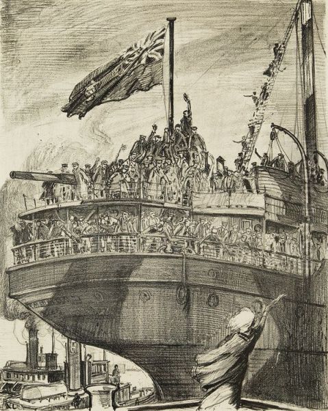 Arthur Lismer's Departure of a Troopship (1918–19) captures a poignant moment of wartime farewell with emotional intensity and modernist vigor. Painted during Lismer's time as an official war artist for Canada, the work depicts a troopship shrouded in mist, surrounded by smaller vessels and shadowy figures waving goodbye—an evocative fusion of solemnity and patriotism. The composition balances dynamic brushstrokes, influenced by Post-Impressionism and early Expressionism, with a muted palette of steely blues and grays, heightening the sense of isolation and uncertainty. As a member of Canada's iconic Group of Seven, Lismer infused landscapes with emotional resonance, and this piece stands out as a rare yet pivotal wartime narrative in his oeuvre. Its historical significance lies in bridging Canadian modernism with collective memory, offering a profound reflection on sacrifice and transience.