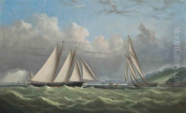 Racing Schooners Rounding The Turning Mark In Osborne Bay With Norris Castle Above And Ryde Beyond: The Prince Of Wales's Hildegarde Rounding The Mark In Second Place