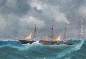 The painting The Schooner-rigged Steam Yacht Catarina At Sea by A. De Simone captures the elegant fusion of maritime grandeur and industrial progress in the 19th century. This striking maritime scene depicts a meticulously detailed steam-schooner cutting through tranquil waves, its sails billowing against a soft, luminous sky—an evocative representation of the transition from sail to steam power. De Simone’s precise brushwork and atmospheric perspective reflect his affiliation with the realist and marine art traditions, akin to the works of maritime masters like James E. Buttersworth. The painting holds historical significance as it immortalizes a technological marvel of its era, offering viewers both artistic beauty and a glimpse into nautical innovation. Its balanced composition and romantic yet factual portrayal secure its place among notable marine paintings of the late 19th to early 20th centuries.
