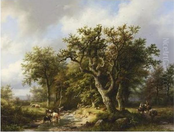 Figures With Cattle By A Forest Stream